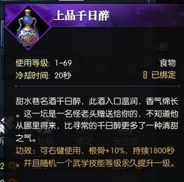 道具描述:甜水巷名酒千日醉,此酒入口温润,香气绵长。这一坛是一名怪老头赠送给你的,不知道他从哪里得来,比寻常的千日醉更多了一种清甜之气。